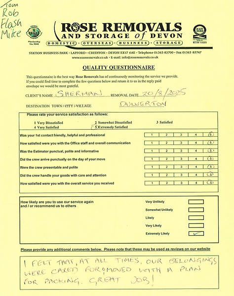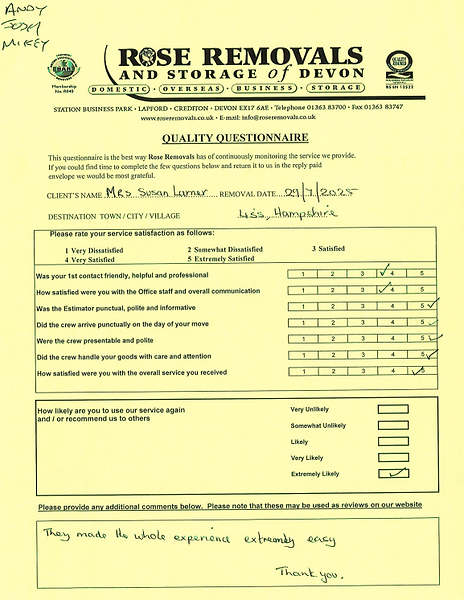 At Rose Removals in Devon, we’re proud of the kind words our customers share. Their feedback reflects our commitment to reliable, stress-free moves and friendly, professional service. Whether it’s a local or long-distance relocation, we handle every job with care and attention. Don’t just take their word for it - get in touch today and see how we can help with your next move. Contact our office and house removal specialists to discuss your needs across Crediton, Exmouth, Tiverton and Exeter.